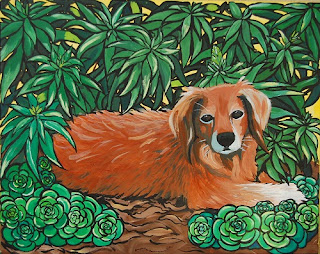 All of the plants were outlined and accented. I love the way this painting turned out with a perfect balance between realism and pattern/design. It was fun to transition from painting the plants with free brushstrokes and working outdoors, to the challenge of painting from a photograph with more specific proportions and complex shapes. Now this little dog is always with us in her special garden!